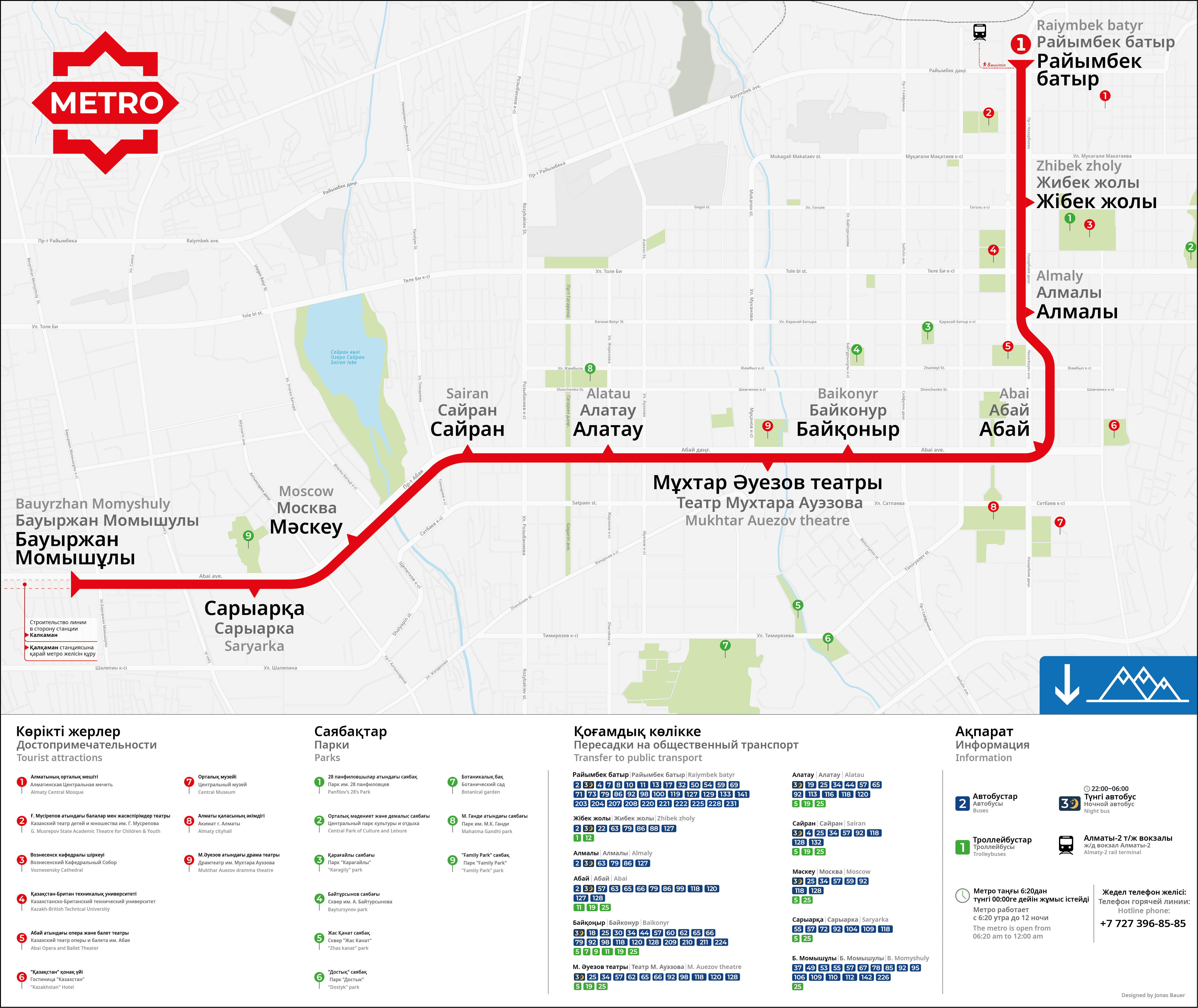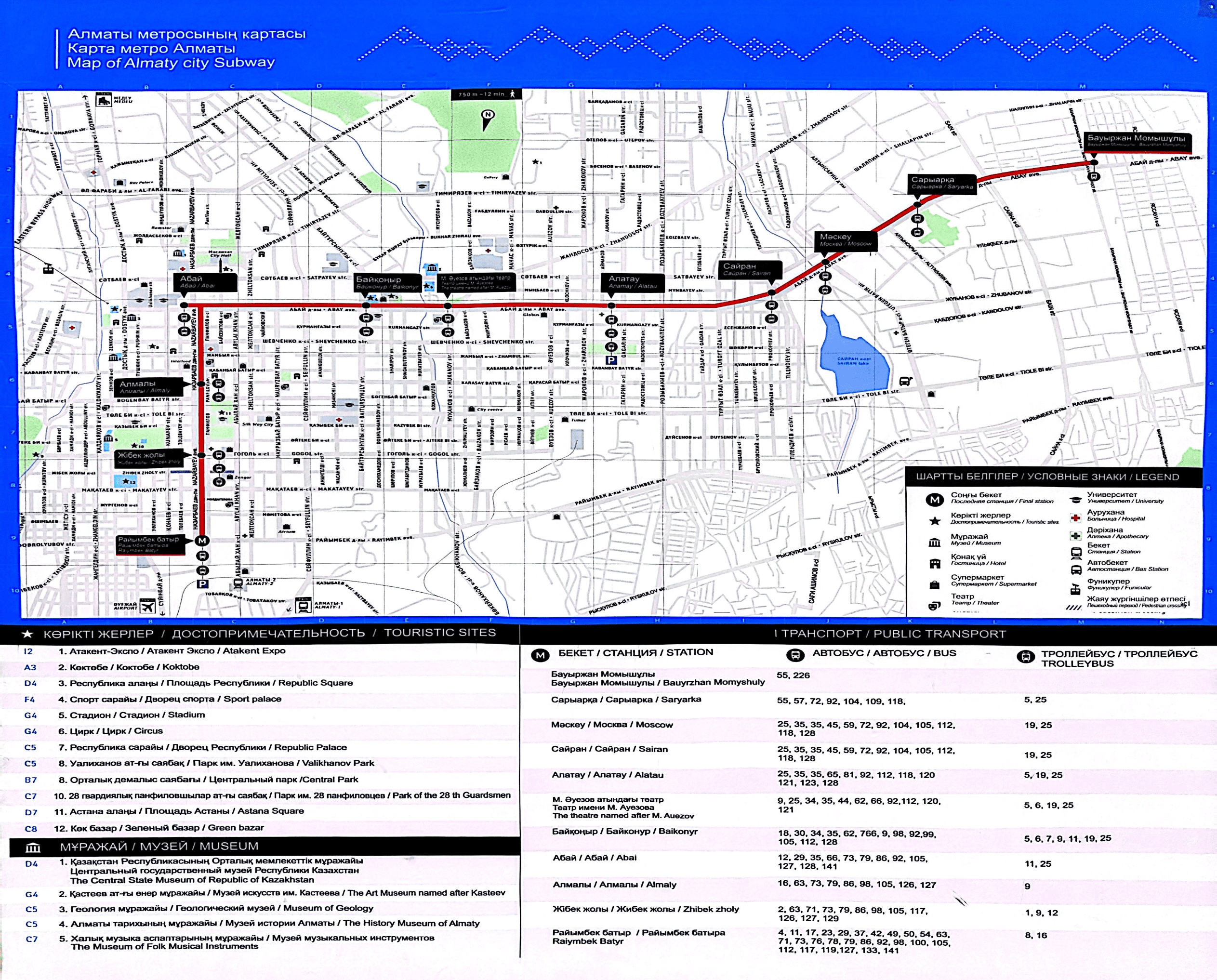 В первом блоке обозначены основные достопримечательности и парки города. Рядом с каждым названием есть цифра, которая так же отражается на карте. Для облегчения поиска, цифры идут по порядку начиная от станции "Райымбек Батыр" и далее вдоль линии метро.